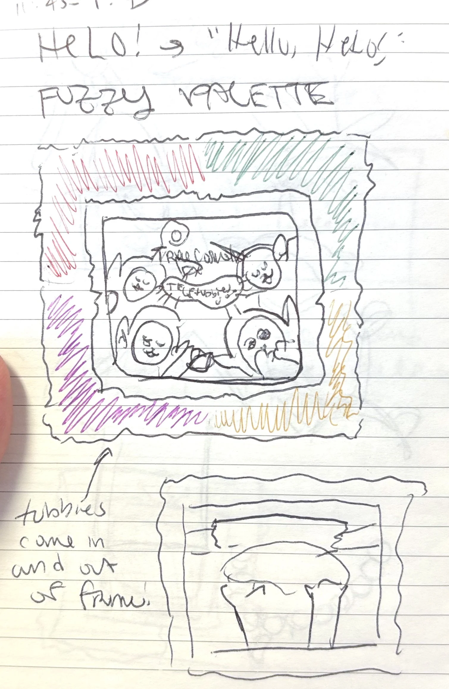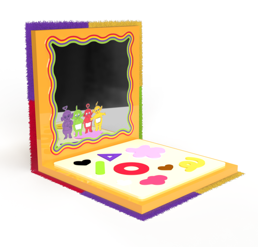 It was decided early that the initially proposed plush exterior would be cut due to production costs in favor of the lenticular effect that would show the Tubbies moving in and out of frame. Upon receiving the samples in person, the lenticular effect was also scrapped — the effect worked nicely, but it didn’t give the whimsical vibes the team was hoping for.
