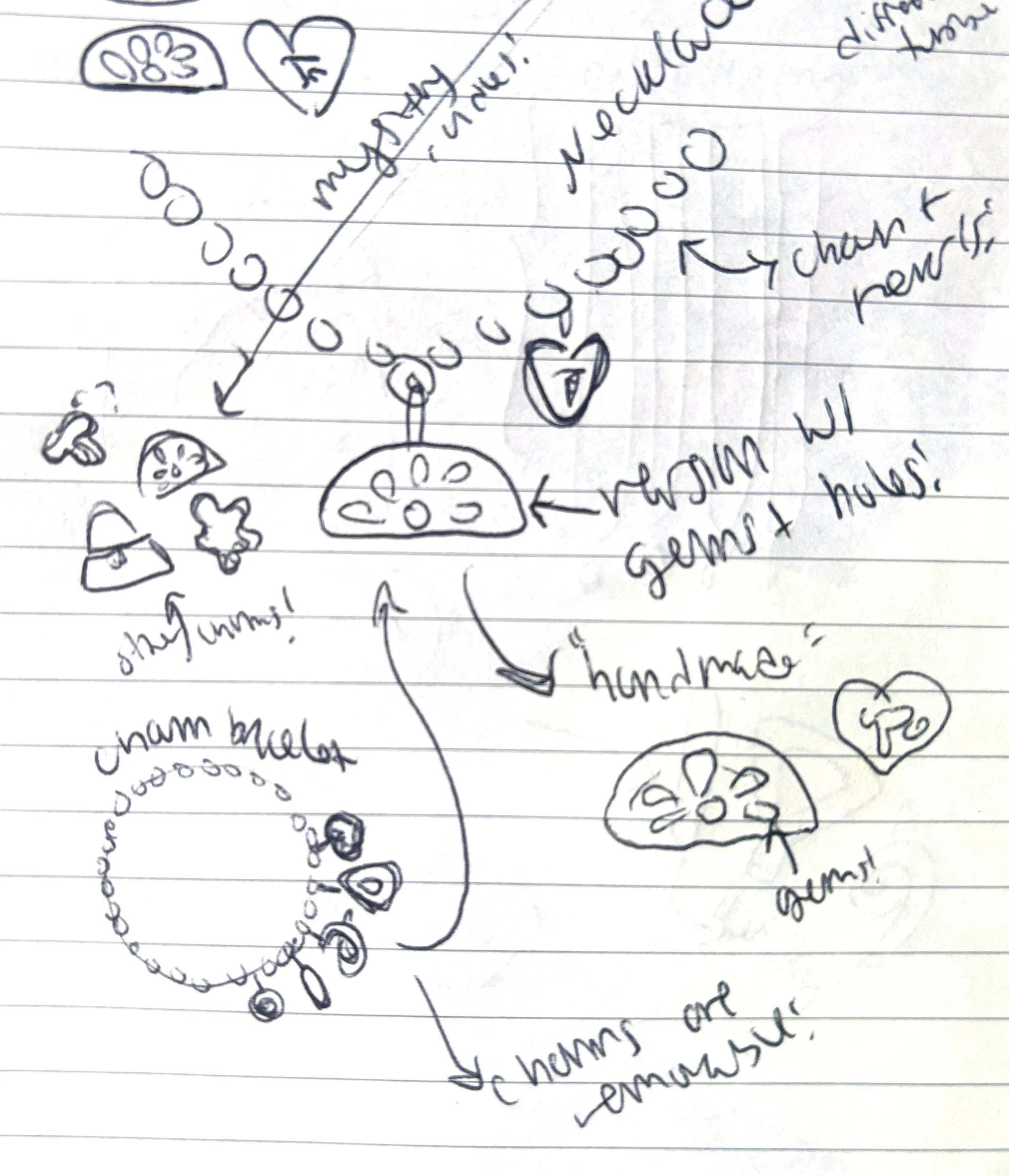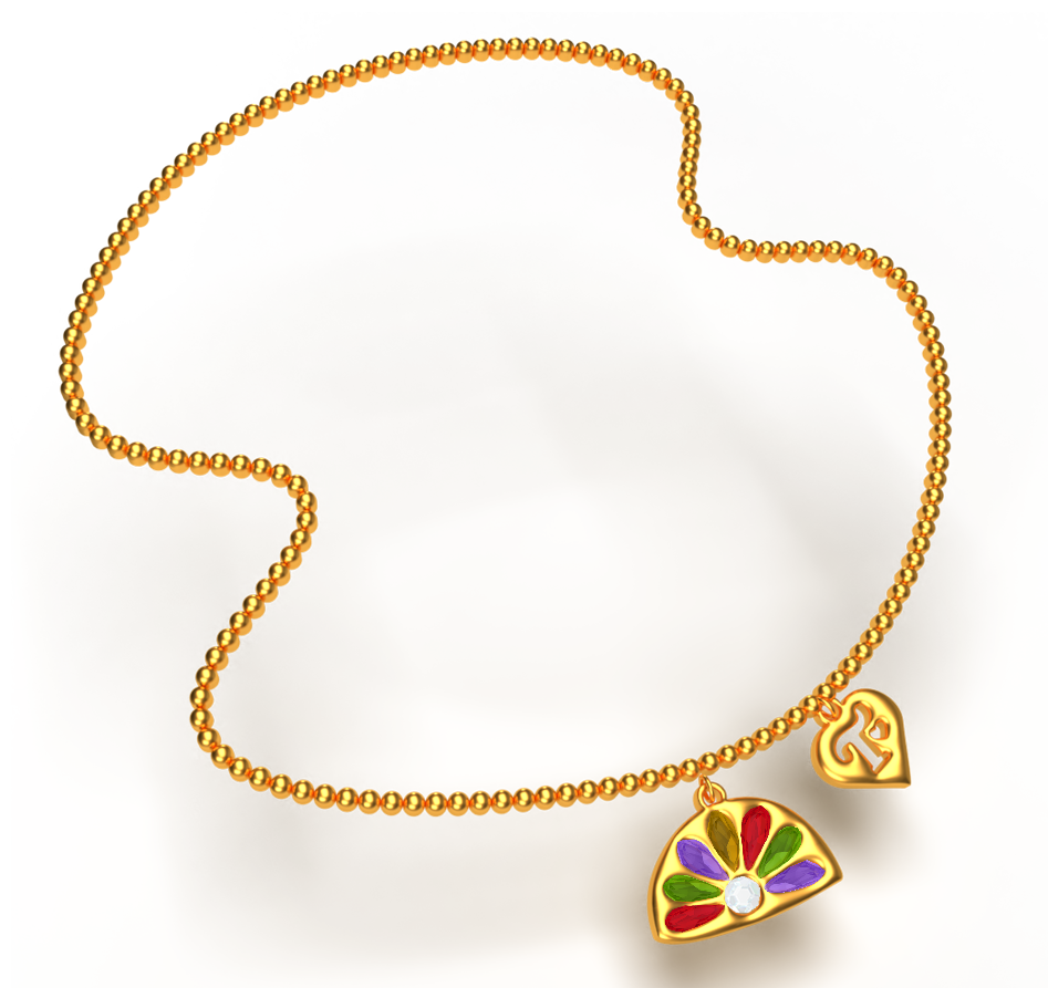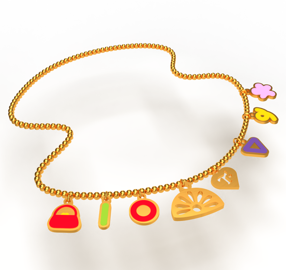 Necklace featuring Trixie Cosmetics logo and Teletubbies door/small logo pendants. Specifically designed to look hand-made/organic, as if the Teletubbies molded the pendants out of clay.