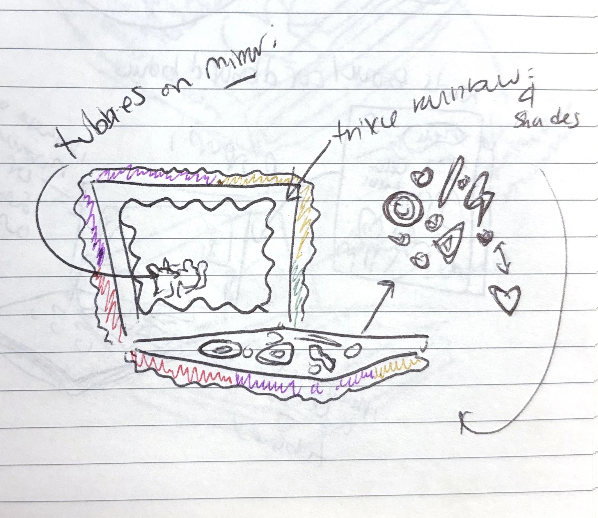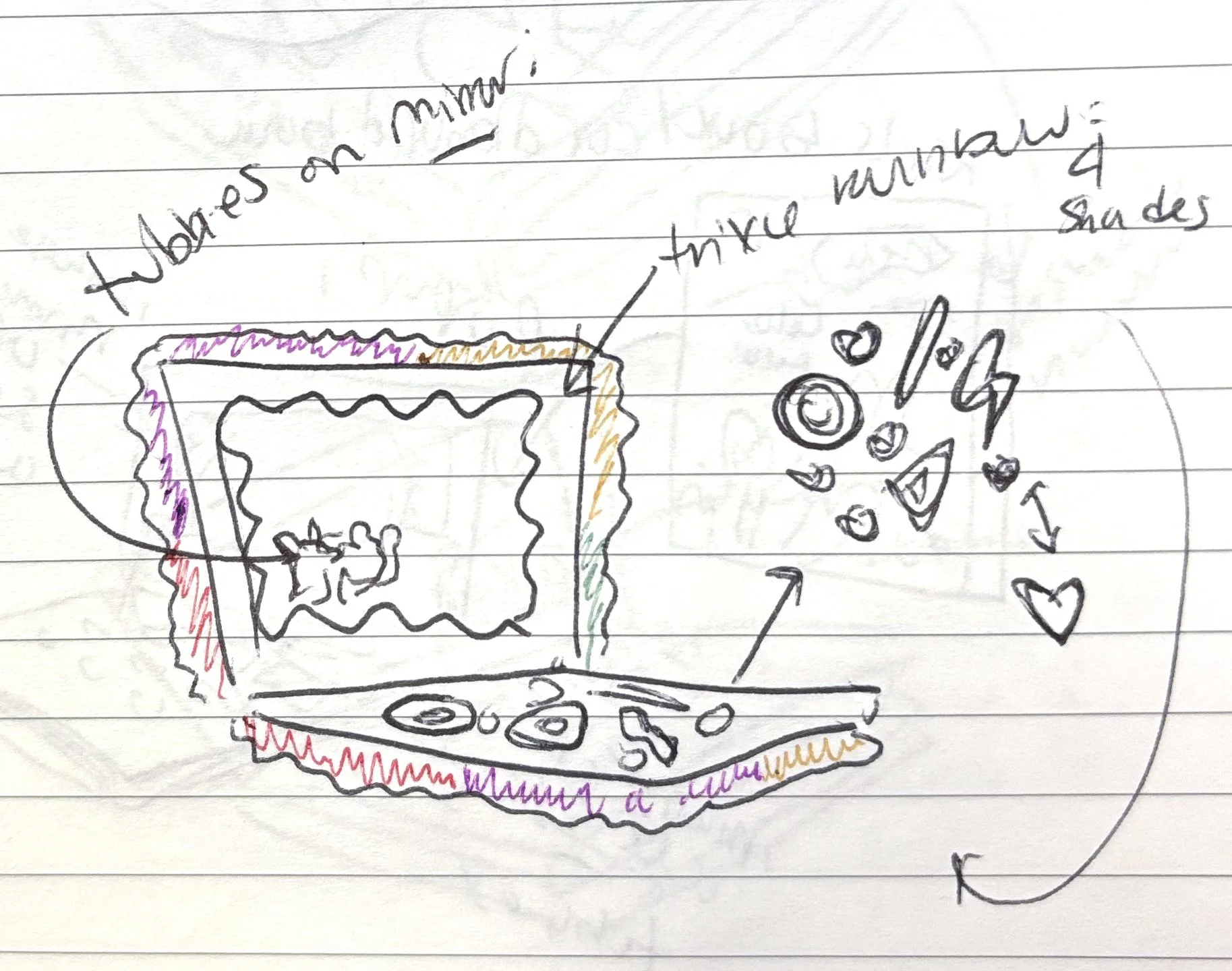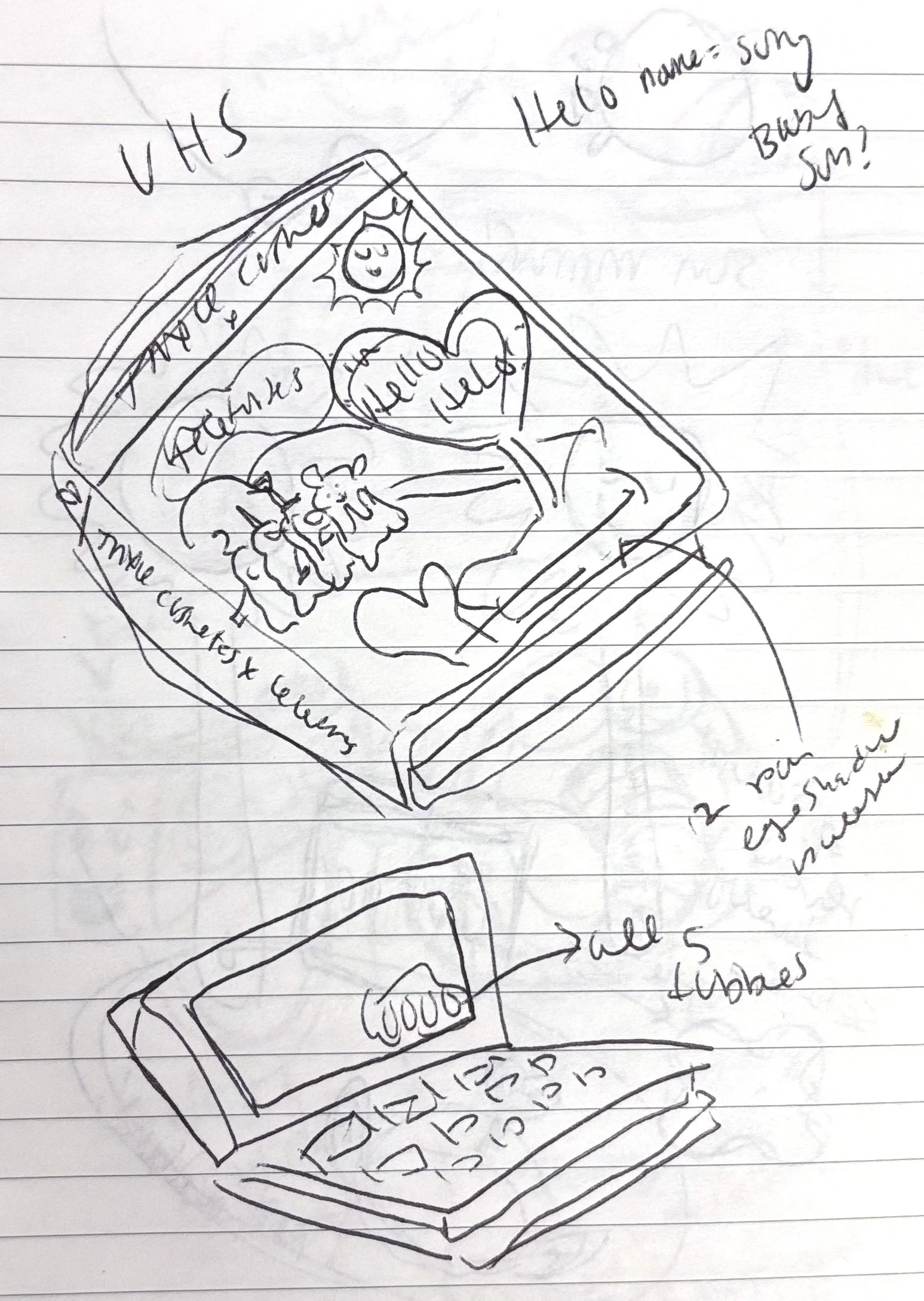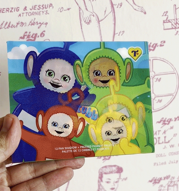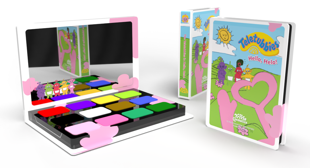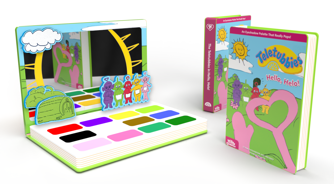 In the beginning of the product development process, I was tasked with coming up with possible concepts for the star of the collection: the eyeshadow palette. These concepts were inspired by both the learning/child development aspects of the Teletubbies show and its nostalgic nature. These ideas manifested in a concept that would find the Teletubbies interacting with a Trixie-inspired character in a pop-up book setting as well as one that would see the same narrative showcased in VHS form.