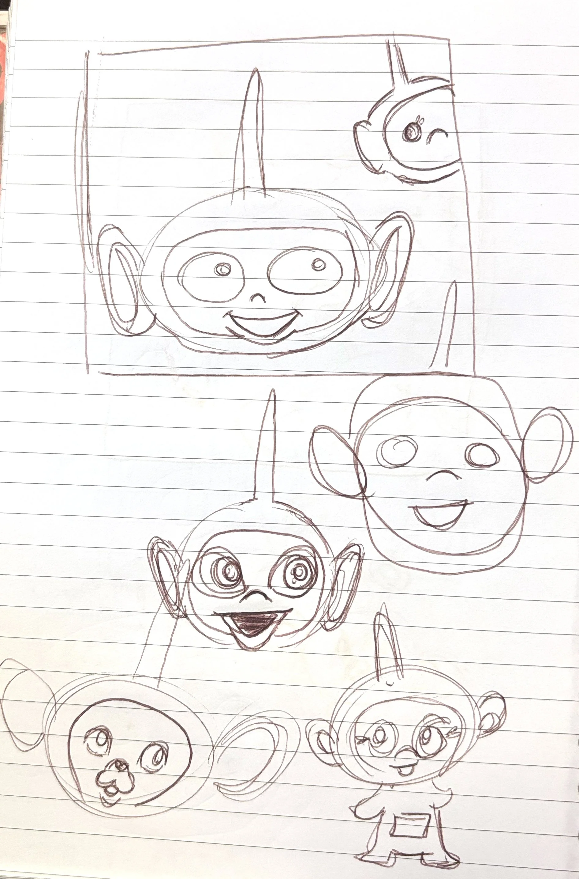 Iterations of Teletubbie character artwork from initial round to final collection artwork.